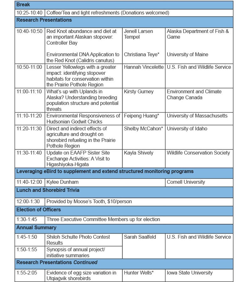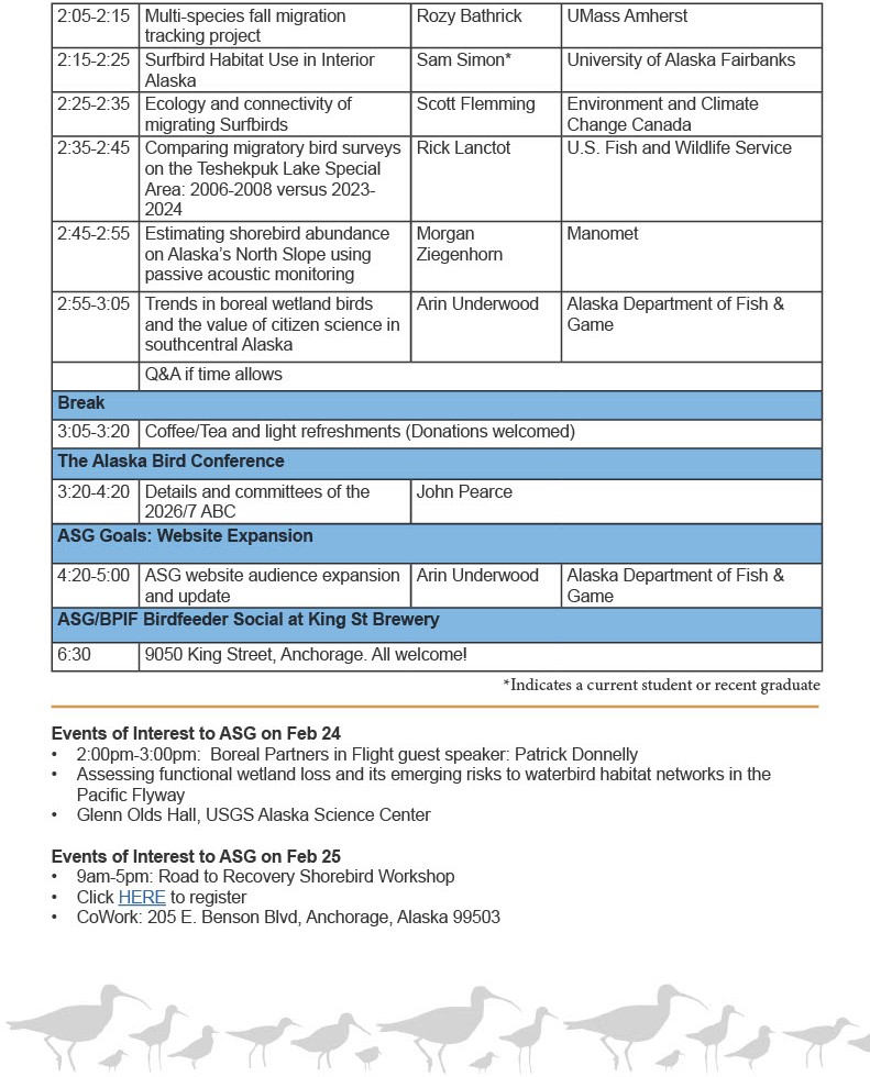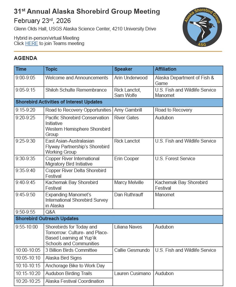 The 31st Annual Alaska Shorebird Group Meeting concerning the projects and progress of 2025 will take place on February 23rd, 2026 at the Glenn Olds Hall, USGS Alaska Science Center, 4210 University Drive, Anchorage, Alaska. Please follow the Teams link below to join virtually. Please view the agenda below. Access a PDF version of the annual meeting agenda HERE.